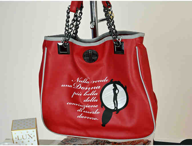 The saying on the front of the bag is: "Nulla vende una Donna piu bella della convinzione di esserlo davvero."