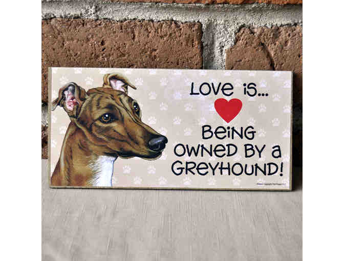Sign on Wood - "Love is... being owned by a greyhound" with Brindle Greyhound