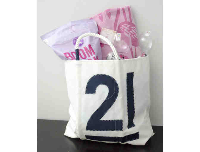 This large, zippered Peter Beaton Sail Bag is filled with all your favorite pink flamingo designs - beach towel, flamingo glasses, and White Claw seltzer! ... and Sweet & Salty Boomchickapop!