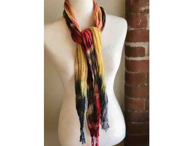 Endless possibilities for wearing these two, yes 2, colorful loom woven ‘Shibori’ cotton scarves.