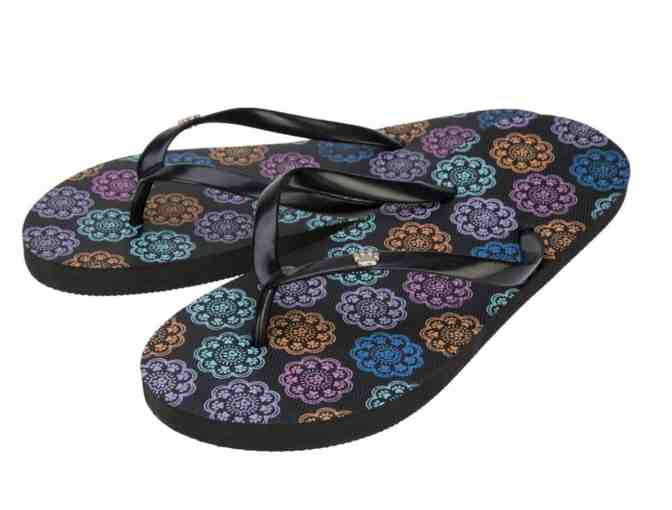 Multi-color paw print mandalas brighten up these sleek black flip flops for a set of heavenly casual footwear. These lightweight, comfortable sandals are the perfect accessory for pet-lovers.