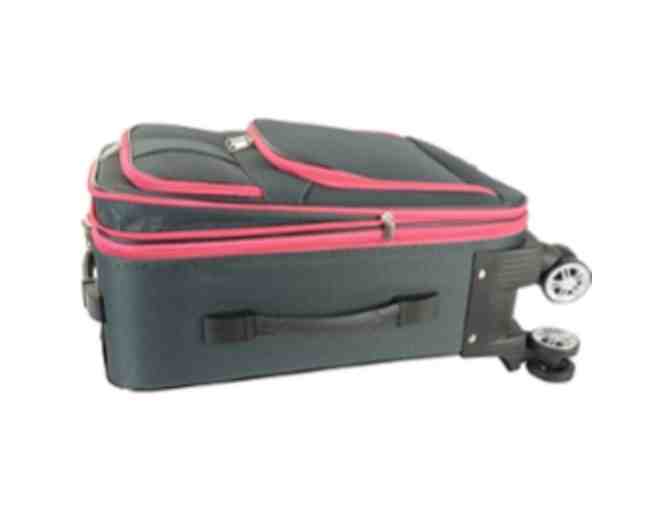 4-wheeled carry-on trolley bag has an expandable zipper and is made of durable 600D nylon. Overall Measures: 21.5" x 3" x 8.25". The lined bag has accenting pink zippers, garment straps, a zippered back pocket, and 2 front zippered compartments. Features a push-lock trolley handle, 360-degree rotating wheels, and top/side easy grab handles.