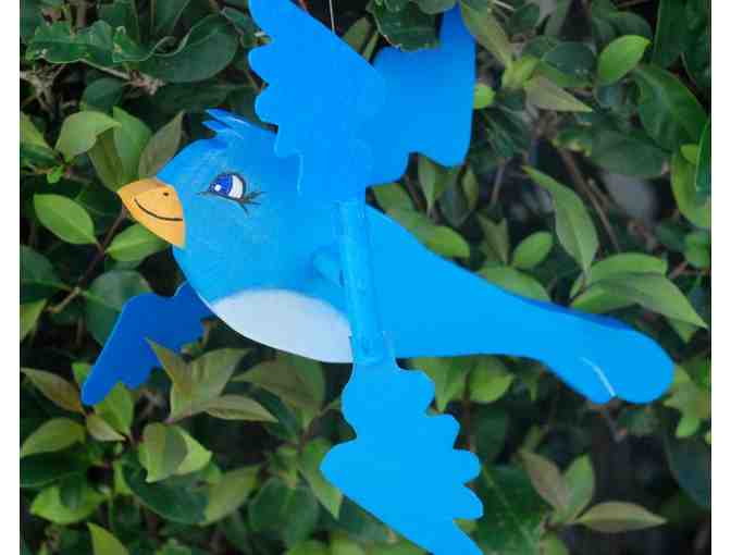 Whirlygigs have wings that spin in opposite directions freely in just a light breeze. Hand painted, hand made whirlygig, cut from pine, painted with acrylic. Great attention paid to details. Measures approximately 6" x 6". Hangs from a nylon string. For indoor or outdoor use. Coated with spray shellac for weather protection.