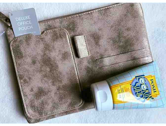 This metallic office carry case has room for everything. Cell phone. Pen. Credit cards and more! PLUS a Big Fat Yummy Hand Creme by Perfectly Posh, to keep hands feeling healthy.