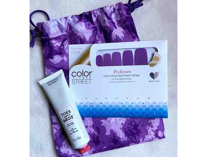 " Toes Before Bros" foot mask by Perfectly Posh and a lovely Purple pedicure by Color Street. What an awesome combo! Cute gift bag too.