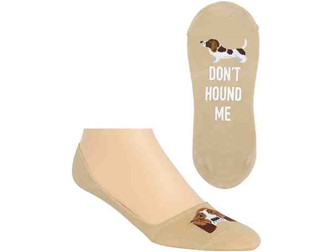 Fun Don't Hound Me no show socks. 52% Cotton 39% Polyester 9% Spandex. Mens size 6 – 12, but will easily fit a womens size 8-10.