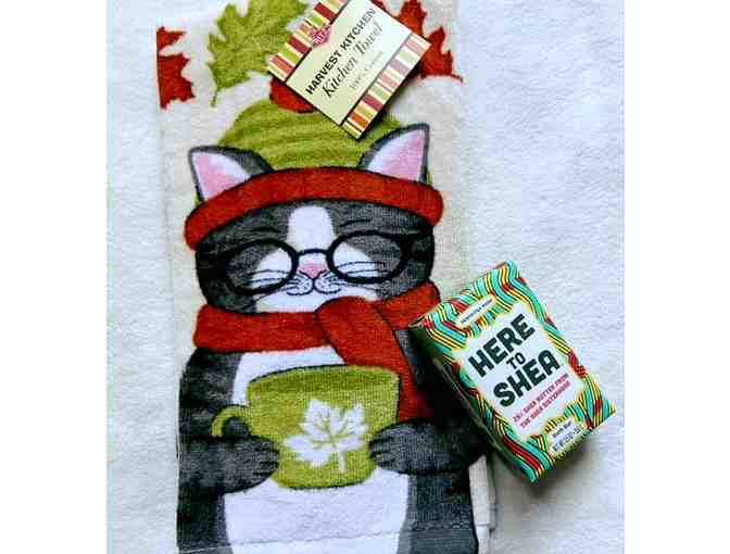 Every time you wash your hands you'll moisturize them, with this "Here to Shea" soap chunk by Perfectly Posh. Then dry them with this "kitt-chen" towel. Purr-fect for Fall.