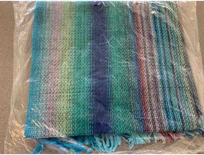 Beautiful loomed scarf with fringe. Large enough to wear as a wrap, or anywhere you need a pop of color.