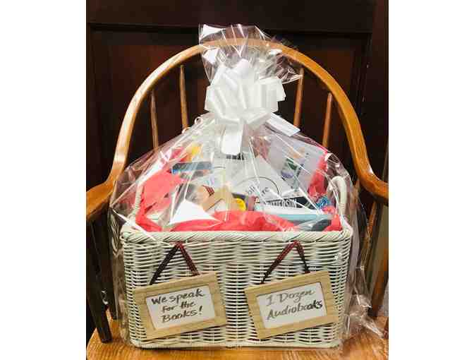 Listening to audiobooks continues to grow in popularity, and with good reason. Enjoy this wicker basket filled with one dozen assorted audiobooks (books on CDs) from a range of popular authors, plus two Pittsylvania County Public Library cards that are your passport to thousands more audiobooks on CD, MP3 player, and as digital downloads -- all for free with your library card. The basket also includes some whimsical library-themed bumperstickers, three whiteboard labels, and a make-your-own signboard (might we suggest: "Don't Bother Me, I'm Listening to My Book!"). If you have a long commute, a long vacation drive, or you just like to work on things while listening, this is a great opportunity to try audiobooks. Audiobooks in the basket include works by David Baldacci, James Patterson, Harper Lee, Alice Hoffman and Joseph Kanon.