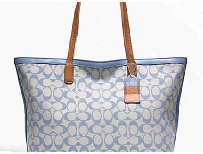 COACH WEEKEND PRINTED SIGNATURE ZIP TOP TOTE - SILVER/GREY CHAMBRAY