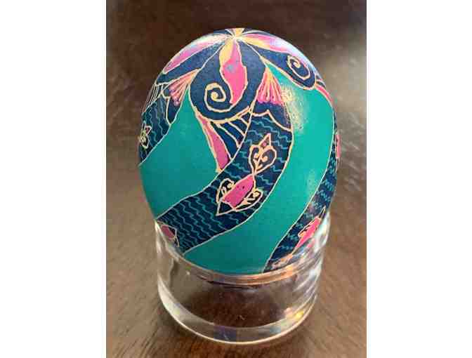 Beautiful Pysanka Ukrainian Easter Egg with display ring and gift box.