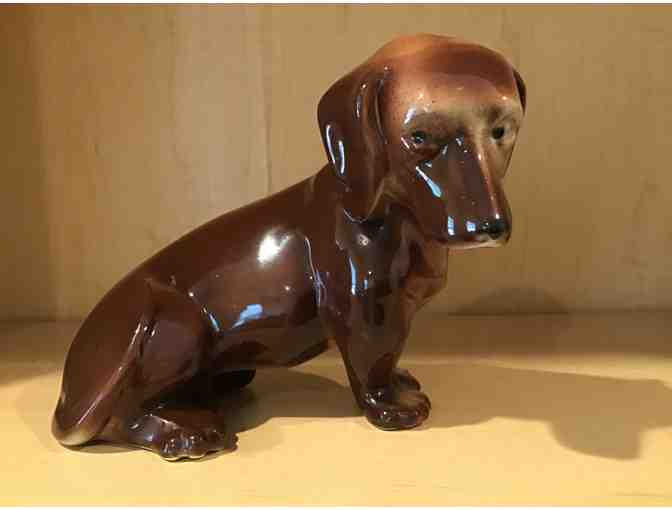 You are bidding on a beautiful (however heavily crazed) sitting brown dachshund dog. His head is tilted down. I found the same piece in an Etsy shop where they advertised it as being from the 1950's however this piece has a cork in the bottom! And it looks like there could have been a sticker over the cork. I couldn't find anything like it in all my internet searched. I don't see any chips or repairs however the piece is heavily crazed. You can see it best on the bottom of the piece. Probably due to its age. He is 5" tall, 7" long and 4" deep. I don't see any kind of mark on the piece.