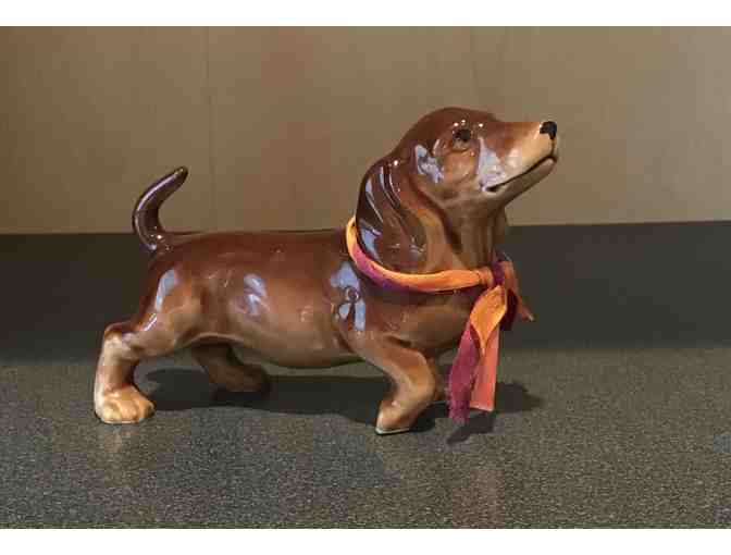 Vintage Collectible Prancing Brown Ceramic Dachshund with a lovely ribbon bow!