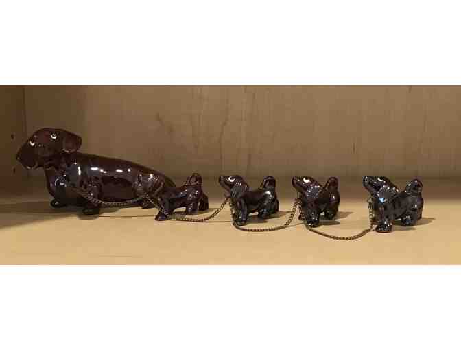 You are bidding on a vintage mommy dachshund with her 4 pups on a chain. This piece is not in perfect condition!! Three (3) of the puppy's legs were repaired with glue. And by the length of the chain, I have a feeling that there is a missing pup from the family. Probably broken beyond repair. There are several chips. But this piece needed to find a home as it's so unique!!! The mom is about 4.5" long and 2.5" tall. Each pup is about 2" long and 1.25" tall. You can see on the bottom is does have an ID number of M-572.