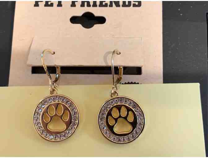 You are bidding on adorable paw cutout earrings Pet Friends! They paw prints circled with clear cubic zirconia stones. These gold-tone for a versatile look for daytime or nightime outings. What a great stocking stuffer! These are 5/8" in diameter.