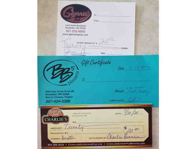 Glynner's, BB's Pizza, Charlie's Eatery gift certificate package