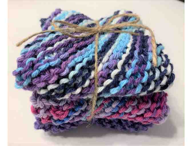Set of 3 hand knitted dish cloths great for dishwashing. They measure about 8" square.