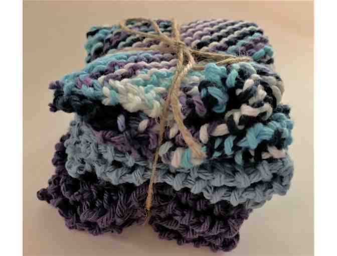 Set of 3 hand knitted dish cloths great for dishwashing. They measure about 8" square.