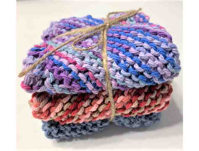 Set of 3 hand knitted dish cloths great for dishwashing. They measure about 8" square.