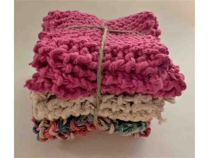 Set of 3 hand knitted dish cloths great for dishwashing. They measure about 8" square.