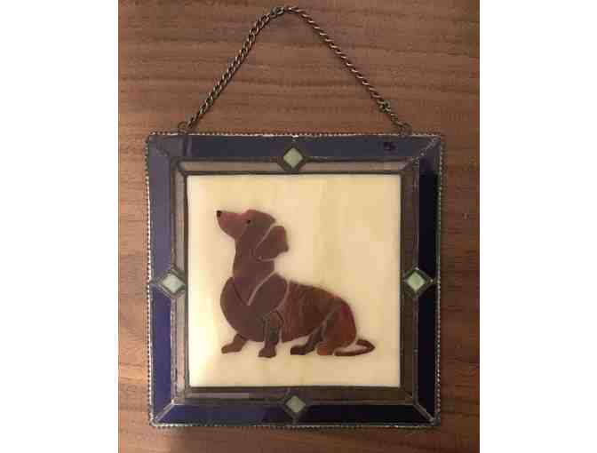 You are bidding on an adorable stained glass sun catcher! The dachshund pieces appear to be glued to the front so it is not quite all stained glass! The piece is 6" x 6" and has a 2.5" drop from a chain. I don't believe this to be handmade but it's still adorable!!