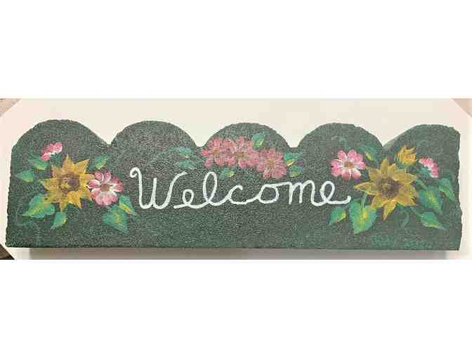 Beautifully painted "Welcome" Landscape block with green background.