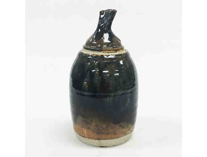 Lid is made with the piece so it fits perfectly. Food safe. Tortoise Shell glaze outside shows flowing dark blues, browns, gold texture.