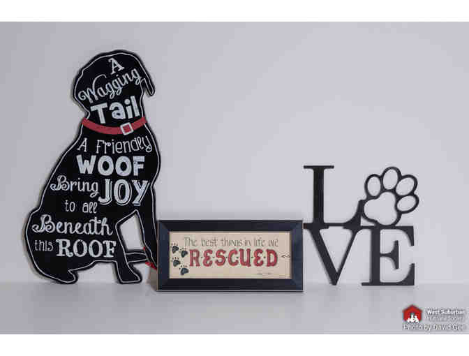 - Dog silhouette reads "a wagging tail, a friendly woof, bring joy to all beneath this roof" (9.5" x 12.5")