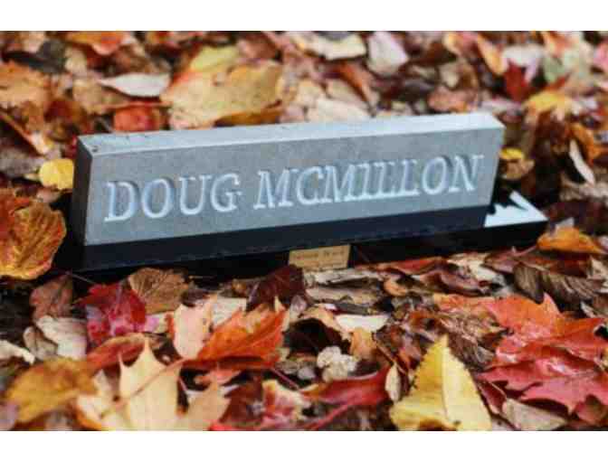 This custom engraved, hand polished, sealed stone is complimented by a black gloss acrylic base and an attached brass nameplate.