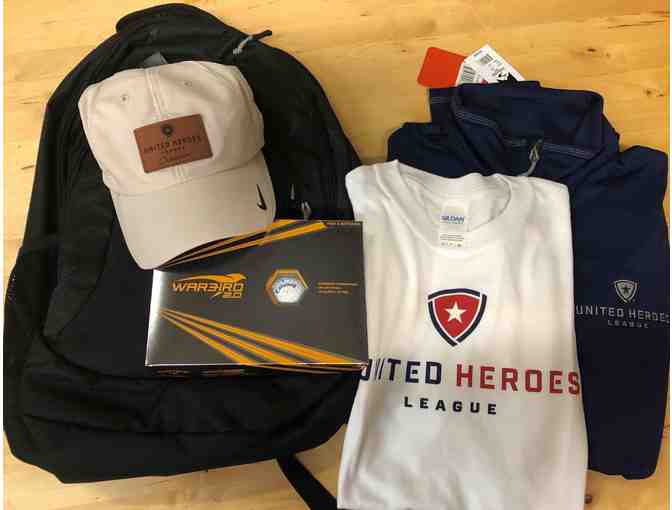 Includes: United Heroes Leage green t-shirt (XXL), white t-shirt (Small), 1/4 zip pullover (Large), dozen Callaway Warbird 2.0 golf balls and hat.