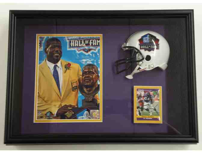 Randall McDaniel unique collectible shadowbox. Hall of Fame mini helmet, 8x10 photo, and player card autographed by Randall McDaniel. Custom framing contributed by Retired Framer's Studio.