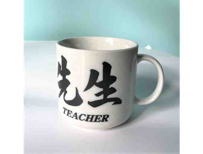 A unique coffee mug with the  word teacher and also Japanese Kanji characters displayed on both sides of the mug.  This would be a gift that any teacher would appreciate.