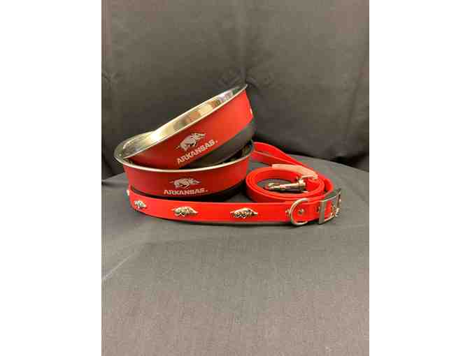 This wonderful Arkansas Razorback pet set is essential for all of your Razorback furry friends. This set includes the following: