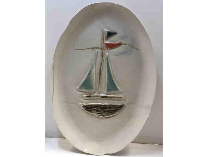 You are bidding on a large ceramic platter with a tactile sailboat in the center that was created by one of the participants in our summer ceramics workshop for adults who are blind and visually impaired.