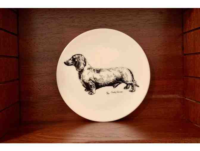 You are bidding on a 4.25" round trinket dish with a Cindy Farmer drawing of a stately dachshund in the center. It is in excellent condition with no chips or repairs. It does appear the dachshund is a decal of some kind. There is no marking on the reverse of the dish. This is a piece that came from the collection that Dachshund Delights donated to AADR.