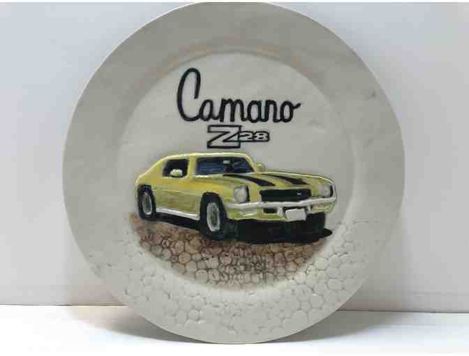You are bidding on a large ceramic plate with a yellow tactile Camaro Z28 in the center that was created by one of the participants in our summer ceramics workshop for adults who are blind and visually impaired.