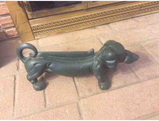 You are bidding on a classic boot scraper in the shape of a dachshund. However, this is not your black traditional cast iron piece. This piece is green and was offered by an family run garden and outdoor living lifestyle business offering original designs in the finest quality garden gifts, outdoor decorative accessories and casual furnishings in PA. It's very difficult to pick up the green coloring of this piece in the pictures. This piece weighs 7 pounds and is 13" long by 4.5" tall. Great to put at your front door or why not keep indoors by your fireplace?