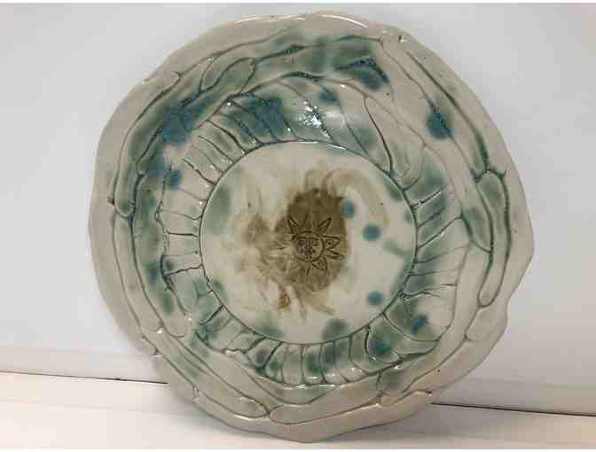 You are bidding on a medium-sized ceramic plate with a tactile sun in the center that was created by one of the adult participants in our summer ceramics workshop for people who are blind and visually impaired.