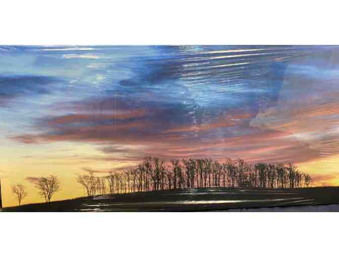 Forty inches long by 20 inches tall, this beautiful photograph is of a sunset over trees.