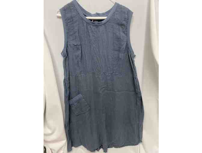 This item is a FLAX linen dress and jacket set in smoky blue, size Medium.