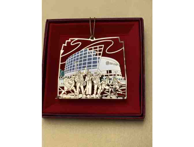 The backpiece of the ornament shows the beautiful BOK Center building and front shows hockey and basketball players, plus artists from pop, rock, and country music. The ornament is solid brass with 24 karat gold wash, and presented in a red leatherette gift box.