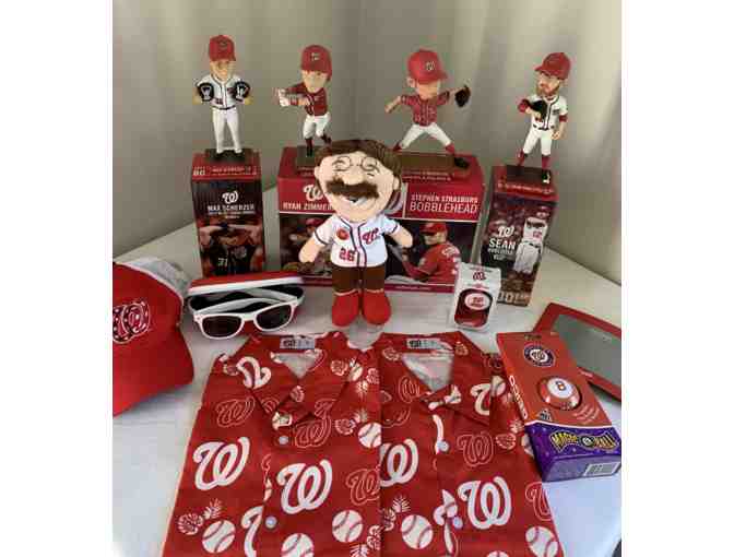 Missing baseball? The Nationals Promo Gift Pack will remind you of the better days at the ball park. Includes: 5 bobbleheads, a hat and sunglasses, 2 small Nats Hawaiian shirts, and more! Go Nats!