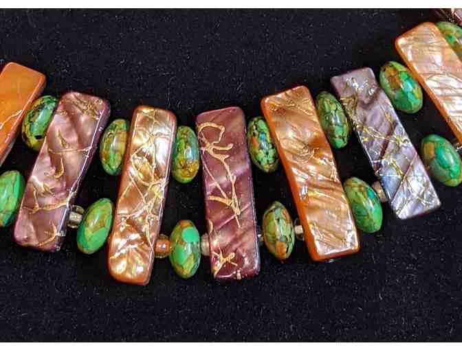 16" rectangle dyed shell beads, with Rainforest Rhyolite Jasper and glass beads necklace. Bracelet is 7 1/2" long with same beads. Matching brass rose clasps.