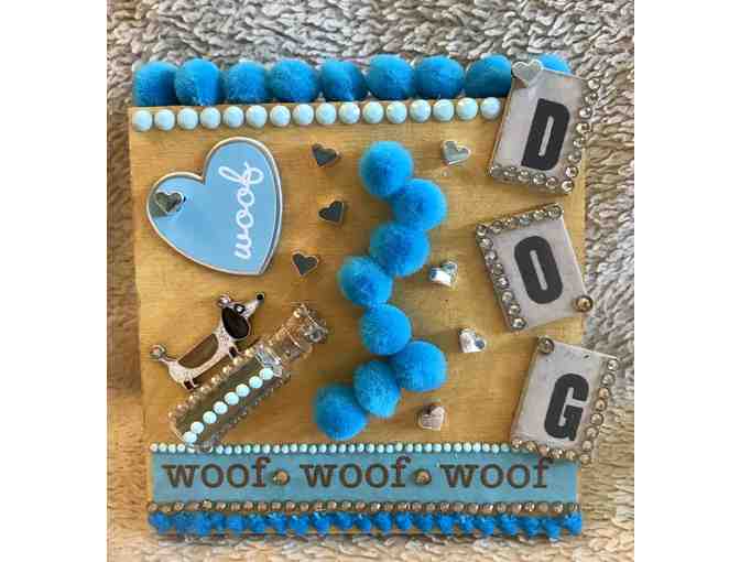 An original mixed media 4"x4" art panel created by Magical Minis and entitled "Woof." The art has a glass bottle integrated into the piece that contains the quote, "Happiness is a warm puppy." by Charles M. Schultz. The bottle is not sealed and the quote may be replaced if desired.