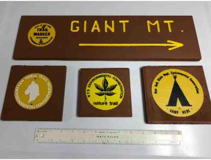 Giant Mountain replica trail sign done in DEC style with authentic DEC Trail Marker. Cedar sign handmade with hanger slot cut into back. Three plaques with DEC markers, Horse Trail, Camping and Nature Trail. Authentic DECmarkers on plaques, made od cedar with hanger slots cut on back.