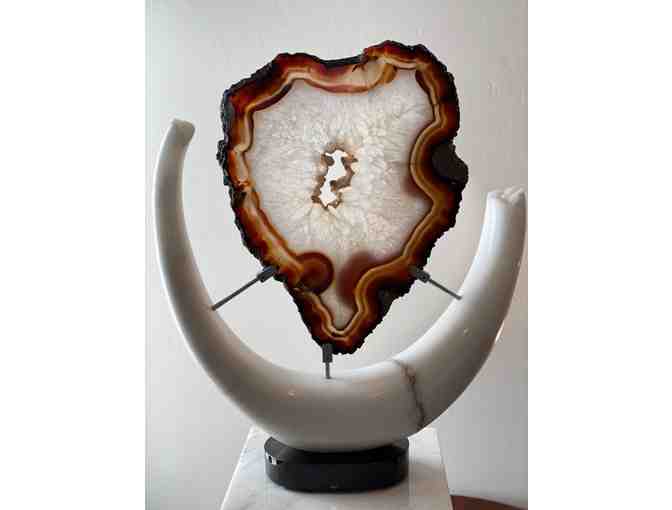 The cradle of alabaster represents the omnipresent Holy Spirit, the creator and sustainer of everything manifest in the universe. The dark banded agate rings represent the lifetimes of hard knocks. The increasingly translucent quartz reaching into the center represents the awakening of the divine spark within all living things. The central crystal-lined opening is the awareness that living with an open heart allows God’s light and love to shine through us.