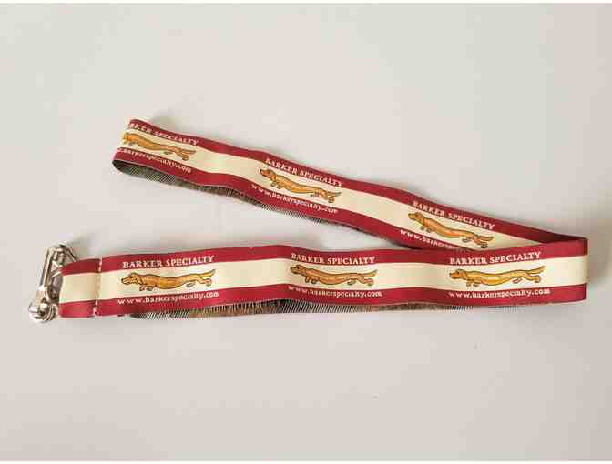 You are bidding on a lanyard with a dachshund. The company is Barker Speciality, a promotional company and their logo is a dachshund.
