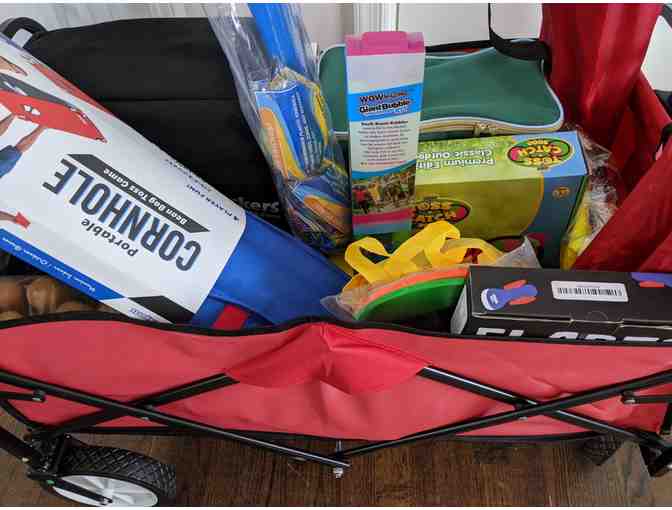 This amazing and fun cart includes: Folding cart, 2 folding chairs, 2 waterbottles, lawn checkers, folding cornhole, lawn jenga, wiffle bat and balls, parachute game, floor darts, velcro toss-n-catch, frisbees, giant bubble maker, slip-n-slide, lawn bowling, ring toss, and paddle ball set. In person pickup, cannot be shipped.