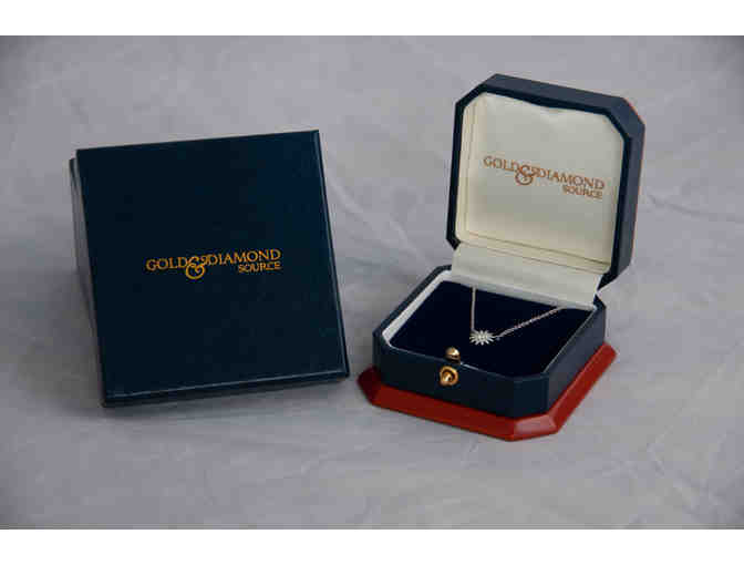 This 14 karat white gold sunburst pendant necklace features 0.18 carats total weight of diamonds. It is adjustable from 16" to 18". The pendant is approximately 7/16" in diameter.