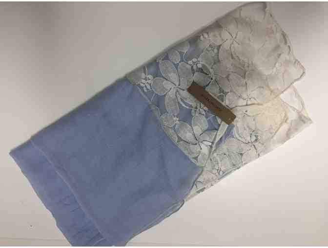 You are bidding on a beautiful blue and lace scarf from Justin & Taylor. The scarf is in new condition and has the original tag still attached.